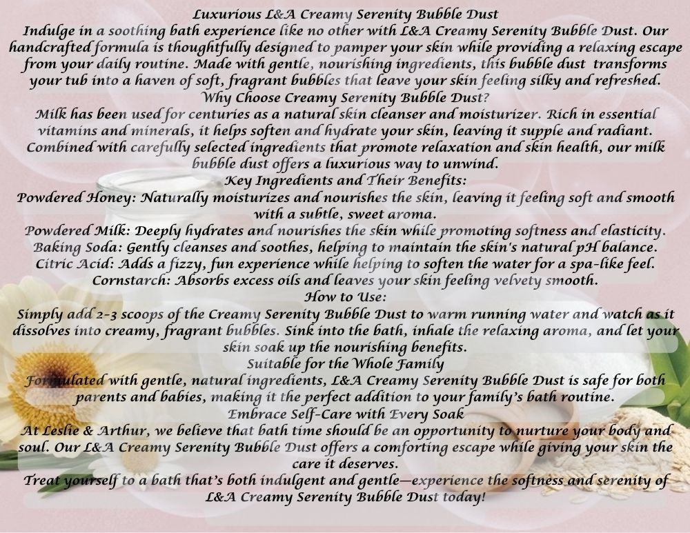 Formulated with gentle, natural ingredients, L&A’s Creamy Serenity Bubble Dust is safe for both parents and babies, making it the perfect addition to your family’s bath routine.